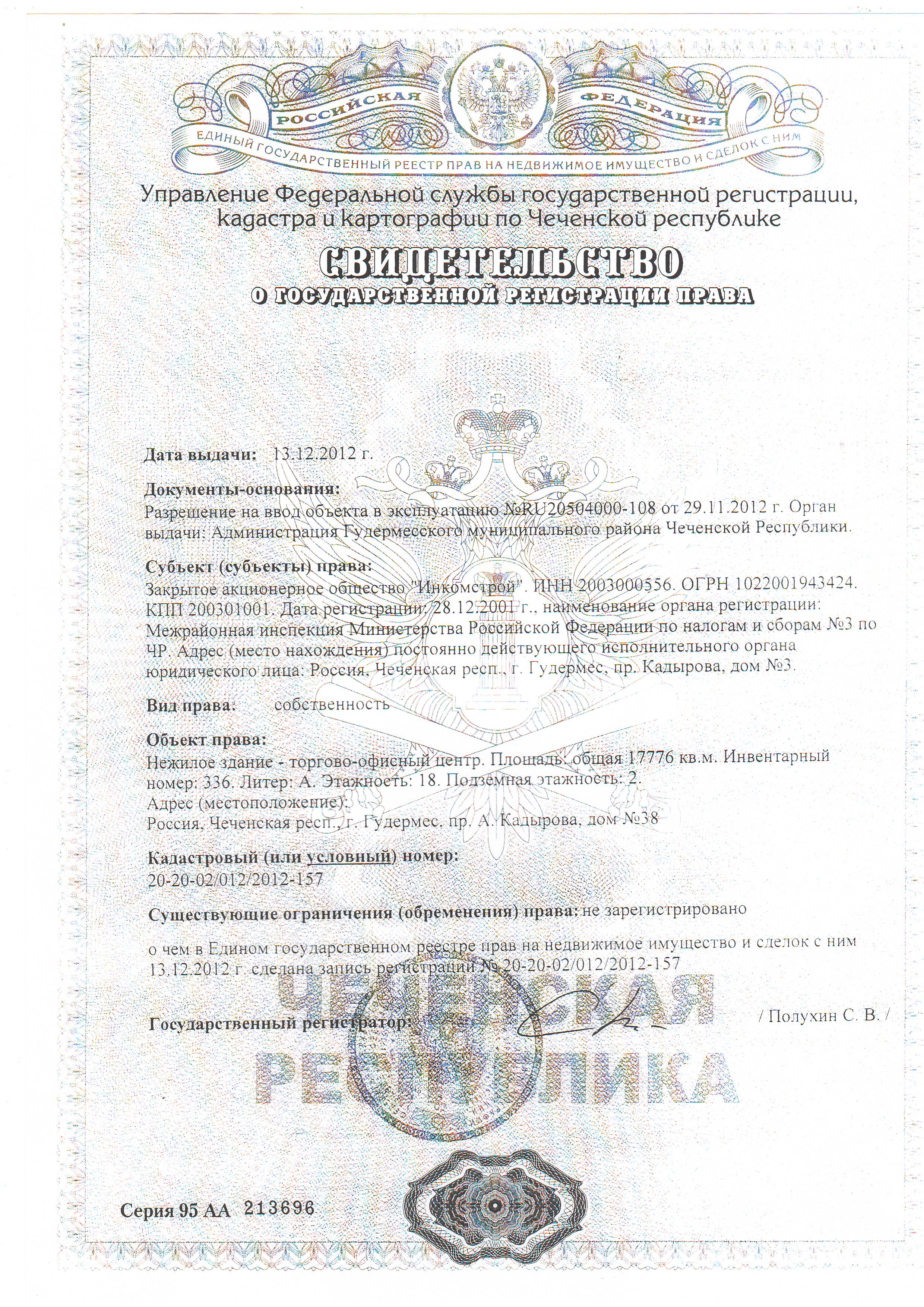 Свидетельство о государственной регистрации права (документ о закреплении территории)